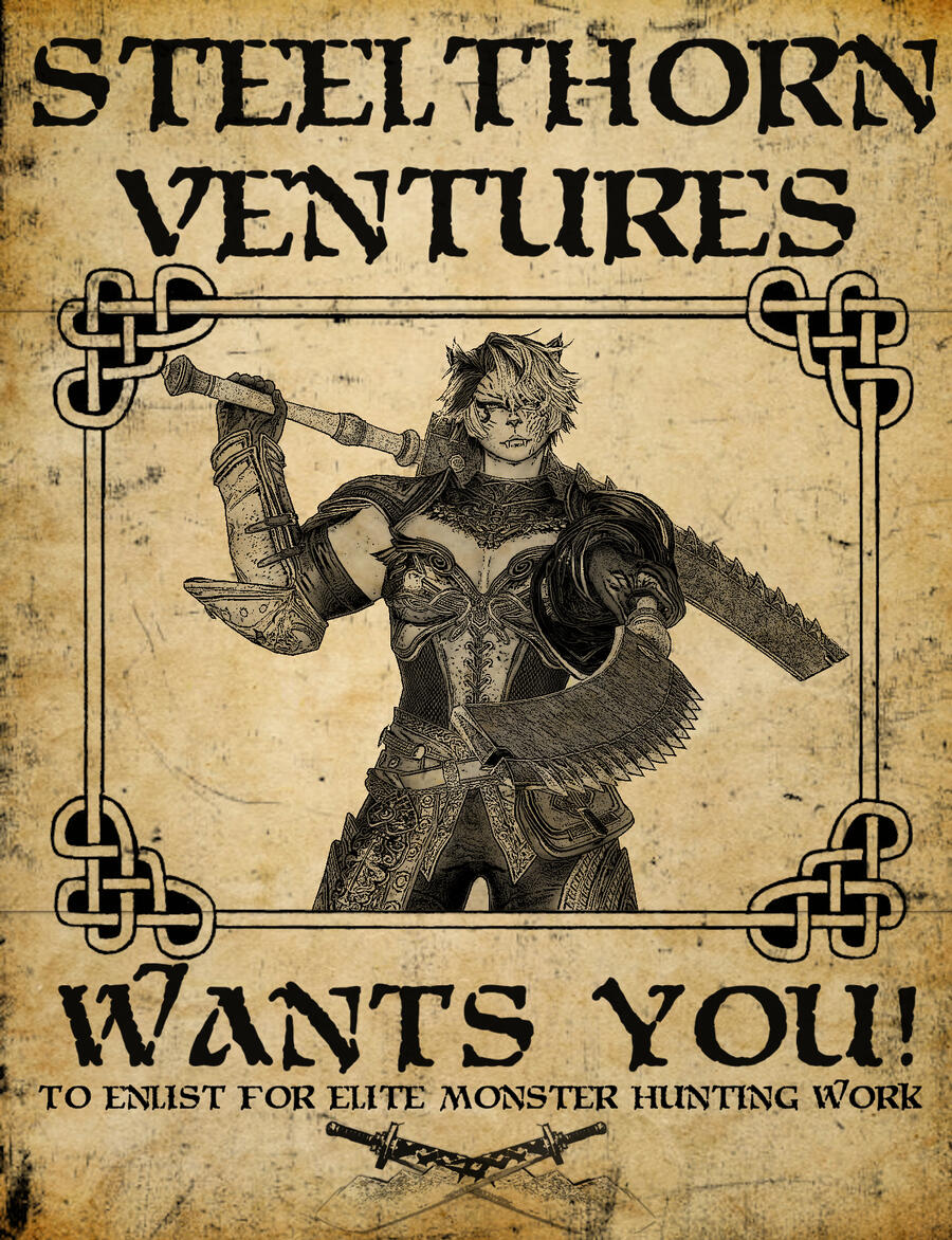 Hey you, yes you. Do you consider yourself a skilled adventurer capable of taking down big nasty critters or potential world ending threats? Then we have the place for you! Come join the Steelthorn Ventures, a Monster Hunting and Adventurer Guild that specializes in taking on those big marks and dangers that the other adventurer's guilds are shy to take on!We like all types here! Strong and beefy, quick and witty, squishy but a magical powerhouse, skilled in some form of trade that can be of benefit to the rest of the guild, all are welcome.If you can pull your weight and make the guild the best it can be, then we want you!